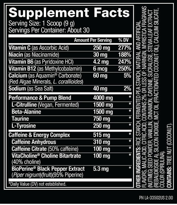 This pre-workout has borderline irresponsible amounts of ultra-concentrated▲ dual-sourced caffeine plus a blend of L-Citrulline, Beta-Alanine, Taurine, neuro-helping L-Tyrosine & Vitacholine®, B Vitamins, and the boss nutrient delivery driver BioPerine®.†